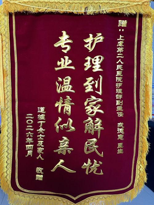 近日,我院护理部收到了患者家属送来的一面锦旗,上面写着“护理到家解民忧,专业温情似亲人”,一面锦旗,不仅是一份感谢,更是一份沉甸甸的信任,这面锦旗的背后,是戎德意护士四年如一日的温情守护。