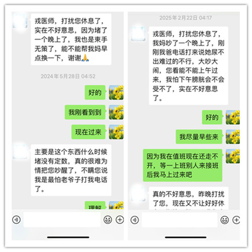 最令家属感动的是,好几次深夜,患者因腹胀难忍疑似尿管堵塞,家属抱着试试看的心态打电话求助,戎德意护士二话不说,立刻从家中驱车赶去,及时为患者解除痛苦,家属表示万分感谢。