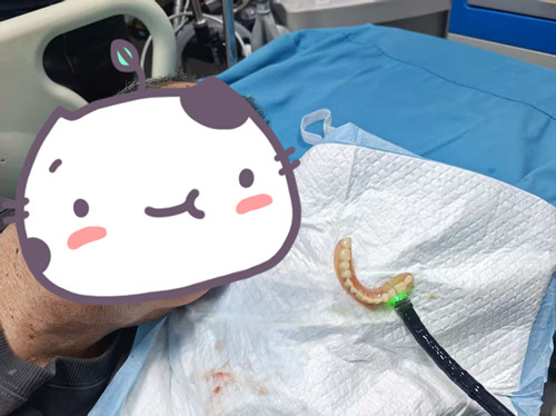 据悉,该老年患者患有冠心病、房颤、慢性阻塞性肺疾病、肺部感染、胸腔积液、呼吸衰竭、心力衰竭,基础疾病多、病情危重。此次不慎将假牙误吞,嵌顿于下咽部食管入口处,不仅导致患者完全无法进食,更因喉间分泌物大量滞留,引发血氧饱和度持续下降,生命体征急剧不稳定,心电监护同时提示快速率房颤,病情瞬间陷入极度凶险的境地。